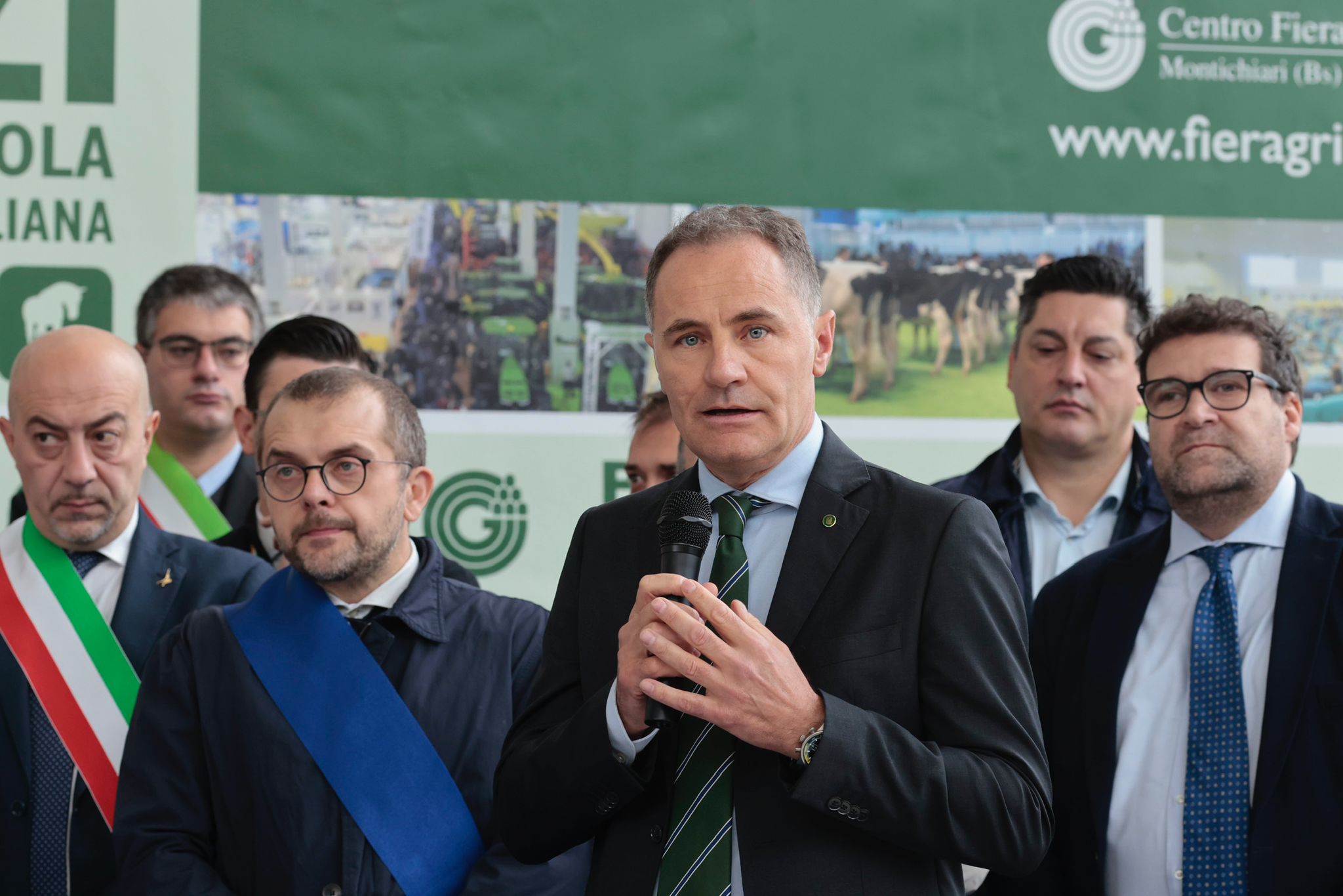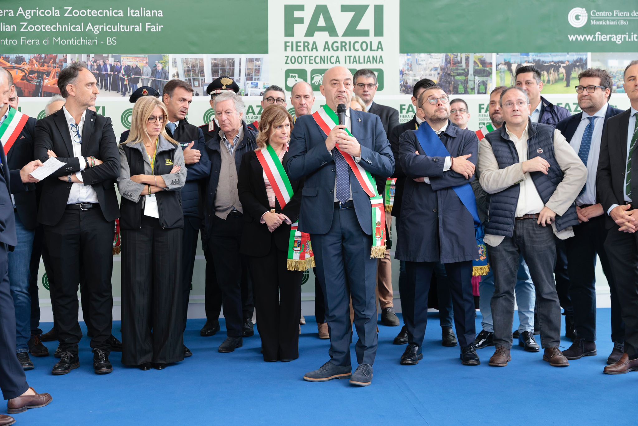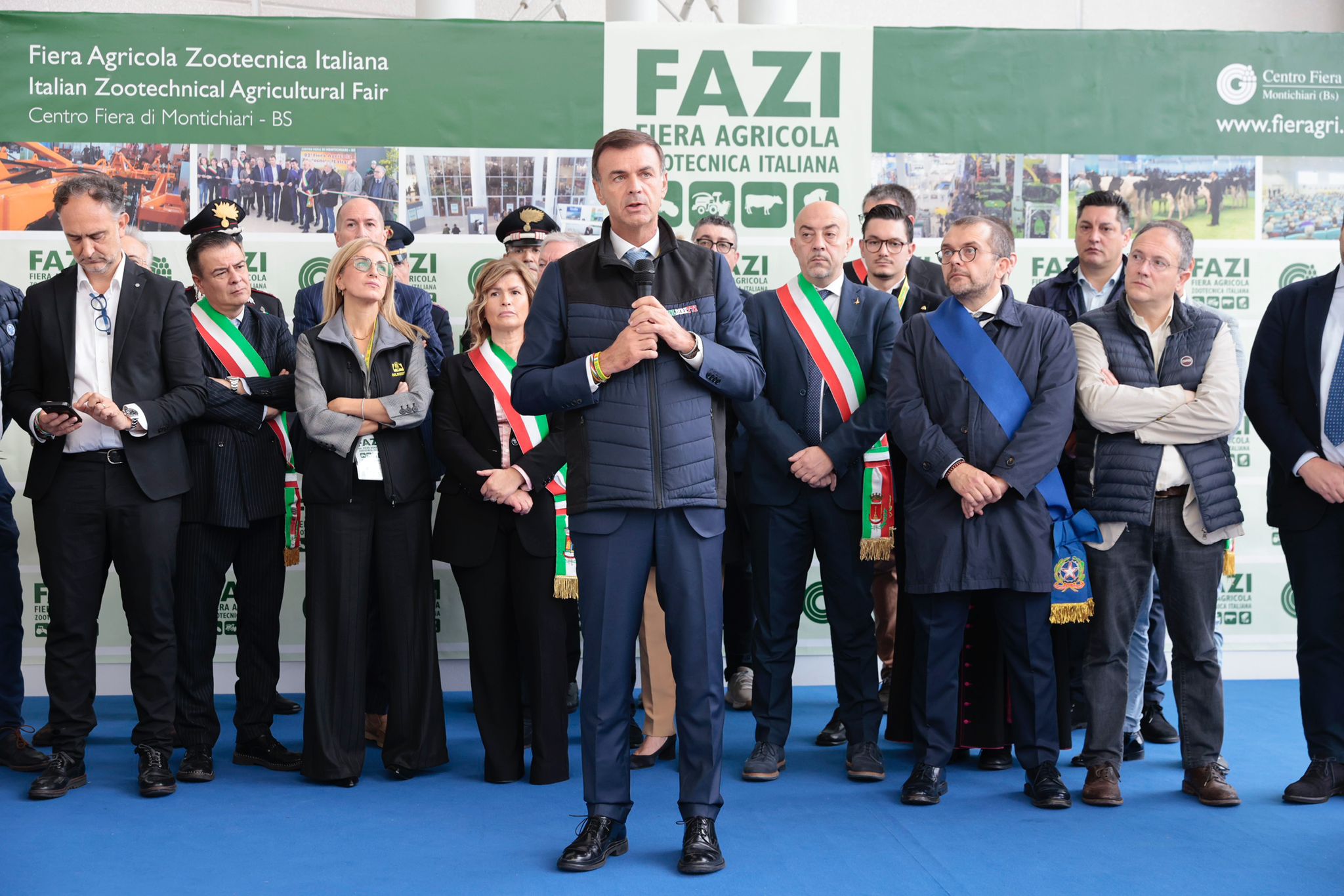 Tra le numerose autorità intervenute nel foyer dell’ingresso centrale hanno preso la parola, nell’ordine, Marco Togni, sindaco di Montichiari, Anna Chiti Batelli, vice prefetto di Brescia, l’on. Mariateresa Vivaldini, europarlamentare, Alessandro Beduschi, assessore all’Agricoltura, Sovranità alimentare e Foreste della Regione Lombardia, Fabio Rolfi, consigliere provinciale di Brescia, Roberto Saccone, presidente della Camera di commercio di Brescia, Giovanni Garbelli, presidente di Confagricoltura Brescia, Laura Facchetti, presidente Coldiretti Brescia, Alessandro Baronchelli, presidente di Copagri Brescia, Fortunato Trezzi, presidente di ANAFIBY, e Ettore Prandini, presidente nazionale di Coldiretti.